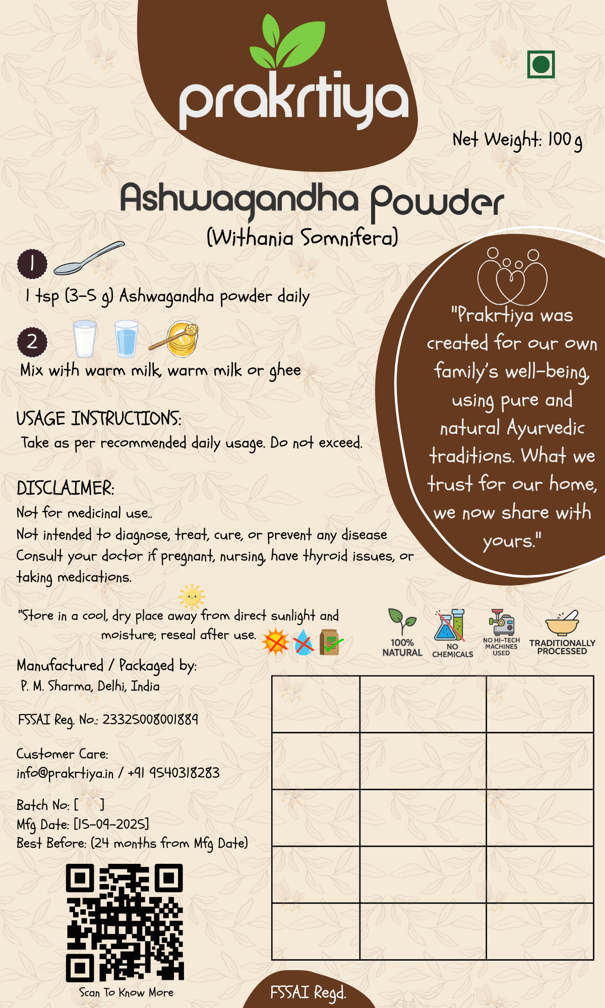 Prakrtiya Ashwagandha Powder (Withania Somnifera) - 100g | Pure Herb